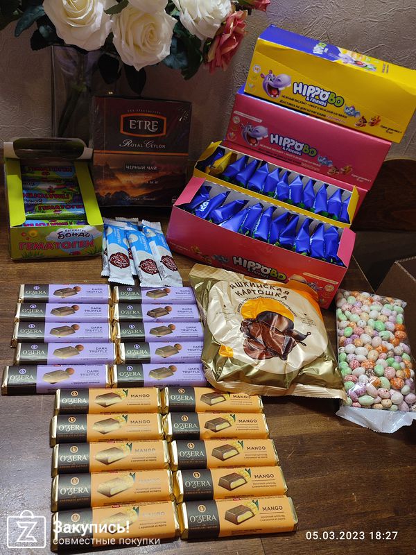 Давно хотела написать отзыв, но всё время руки не доходили. Печенье чоко-пай заказываем только коробками, эта уже вторая. Семья сказала, магазинные в красной коробке вообще не покупать). Эти всегда свежие и не крошатся. Шоколадки ozera с манго вкусные, внутри жидкая начинка. Трюфель тоже вкусный, чувствуется вкус шоколада. Ребенку бисквиты и гематоген очень нравится. Берет в школу на продленку. Спасибо за закупку! Всегда всё вкусное, свежее!!!