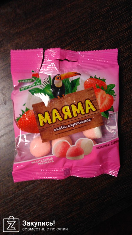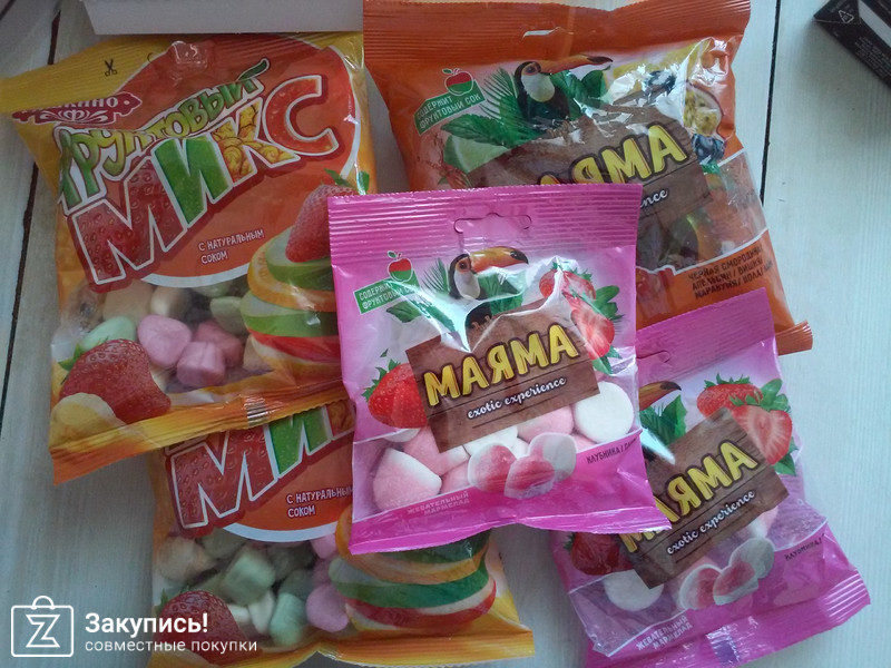 Заказывала мармелад Маяма (со вкусом черники и малины со сливками) и Маяма в форме змеек. В мармеладе с черникой и малиной внутри жидкая начинка, он кисленький, и он слаще, чем змейки. Змейки очень приятные на вкус, не приторно сладкие, как по мне, так это идеальный жевательный мармелад. Сыну очень понравились оба вида, сказал \"покупай мне теперь такие всегда\". Так и сделаю, тем более что цена на мармелад раза в 2 ниже, чем в магазине, а качество очень хорошее, и мармелад свежий.
