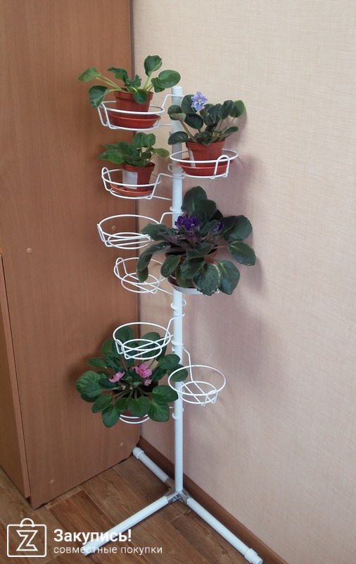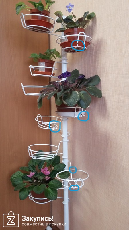 Заказывала подставку напольную Олива на 9 горшков. Высота 124,5 см. диаметр горшка 13см. Реальный товар соответствует описанию. Но заявленным 9 горшкам на 124 см тесно однозначно. Специально на фото поставила горшки со взрослыми цветами и недавно купленными детками. Если детке в отведенном ей месте комфортно, то большому растению явно тесно. В результате в мебельном магазине была найдена железная труба на 2м и сегодня будет куплена и заменена. Вывод - можно на сайте выбрать нужное кол-во держателей и собрать стойку в соответствии с ростом имеющихся цветов, благо они продаются отдельно (первое место, где такое увидела!!). Ну и сами держатели, видимо в результате транспортировки, облупились. Может, другие краски (не белая) лучше держатся на железючинах, не знаю. В принципе, это не сильно критично, можно и подкрасить. В целом, фиалочки довольны)))
