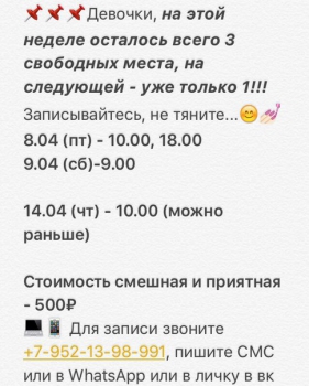 По вопросам записи звоните +7-952-13-98-991, пишите СМС или в WhatsApp, а также можете со мной связаться в вк, моя личная страница https://vk.com/lidasavelyeva
