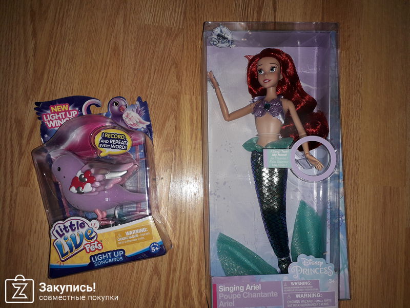 Поющая принцесса русалочка Ариэль из Disney, брала в период хороших скидок, в качестве подарка (невестам из садика)))) она КРУТАЯ!!!, ооооочень красивая, роскошные волосы, руки на шарнирах, высота около 30 см, мерцающий атласный хвост с имитацией чешуи, под хвостом классические ноги, поет при поворе руки.