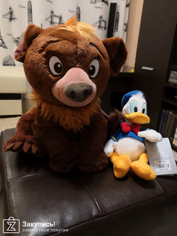 Дисней: медведь Кода плюшик мягонький, но форму держит, все детали вышиты, нет ничего приклеенного и твердого; дональд Дак, тоже мяфкий, прикольный такой. Вышли 1000 и 370 с доставкой, фабрика Вьетнам.