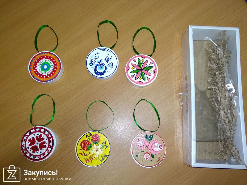 В наборе 6 шт, упакованы в коробочку. Узоры четкие: ощущение, что сделаны по трафарету. Тяжеловаты по весу для ёлочки, для сосны и искусственной елки нормально. Заказывала детям как наглядный материал для занятия по русским народным ремеслам.