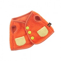 Уютный зимний комплект для кота Басика — красная шапочка из вязаного трикотажа с помпоном, белоснежный меховой жилет и красные варежки.