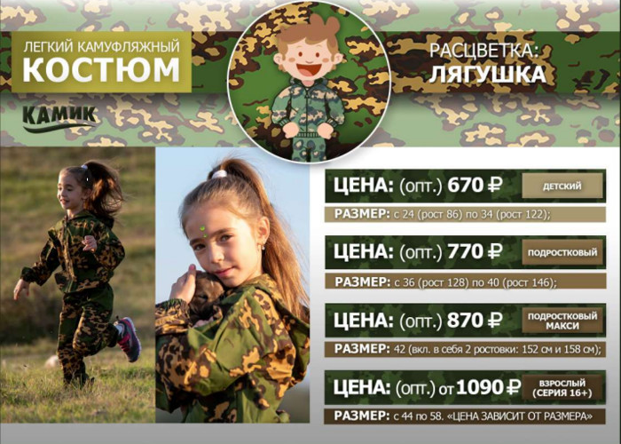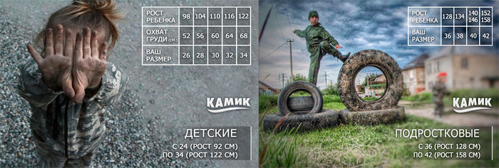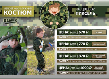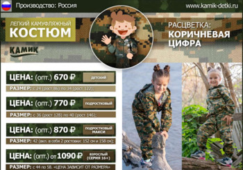 КАМИК – предприятие по пошиву одежды из камуфлированных тканей для детей, подростков и взрослых. Удобные практичные модели одежды для активного отдыха не оставят вас равнодушными! В ассортименте также берцы - высокие ботинки на шнуровке для детей и взрослых!