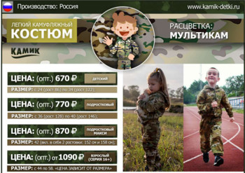 Закажем деткам и их родителям классные лёгкие камуфляжные костюмы, брюки, футболки, банданы. Идеальны для поездок в лес, на пикник, на рыбалку, на дачу, да и просто для всех, кому нравится такой стиль. Можно одеть всю семью в Family look, выглядеть, как одна команда! В ассортименте также берцы - высокие ботинки на шнуровке для детей и взрослых! Цены отличные!