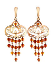 серебряные серьги в позолоте, украшенные вишнёвым янтарём