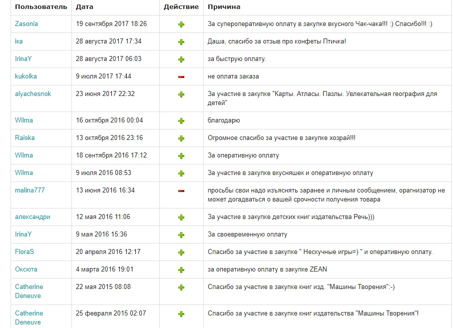 | Пользователь | Дата | Действие | Причина |