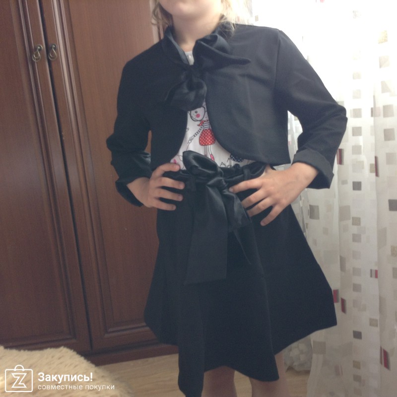 Получила сегодня ребенку пиджачок и юбку плюс блузку. Качественные вещи, размер в размер. У юбки поясок из атласной ткани, из нее же завязки у пиджачка. Вообще, пиджачок очень оригинальный- рукава 2/3 и нет застежек, он щавязывается у воротника на атласную ленту. Вроде бы школьный пиджачок, а с изюминкой, оригинальный.