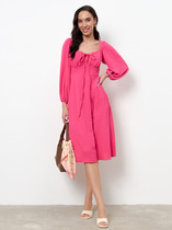 Платье из текстильного полотна штапель, длиной миди, без рукавов. V-образный вырез горловины с отложным воротником и обтачками по горловине и пройме. Спереди шов, по бокам широкие обтачные завязки. Внизу изделия по бокам разрезы.