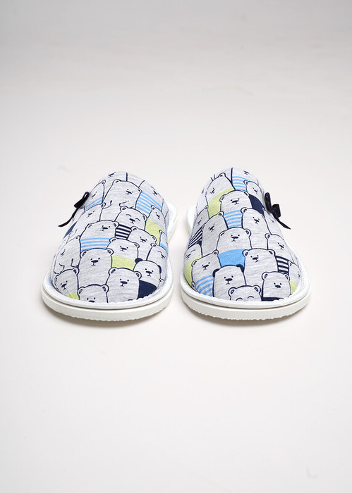 Домашние тапочки с закрытым носом из хлопкового трикотажного полотна, сверху нашивка бант. Толстая подошва.