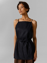 Блуза женская прямого силуэта на тонких бретелях. На детали переда застрочены вытачки. По боковым швам внизу обработаны разрезы. В районе талии по боковым швам вставлены петли под пояс из основного полотна. Нижний срез блузы обработан швом вподгибку с закрытым срезом.