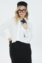 Блузка женская прямого силуэта из сатиновой ткани. Горловина круглой формы, в горловину втачан стояче-отложной воротник. Центральная застежка на пуговицы.