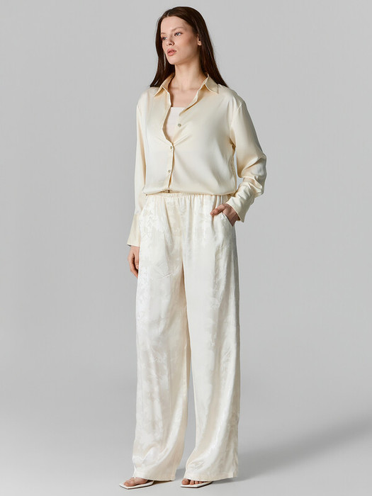 Брюки прямые свободные, посадка средняя. Пояс цельнокроеный с эластичной тесьмой внутри (20мм 20RV). С внутренней стороны пояса пробиты петли и втянут шнур-бейка из основного полотна. На деталях переда обработаны карманы-хулиганы. Подкладка карман из основного полотна. На правой детали переда имитация гульфика. Нижние срезы обработаны швом вподгибку с закрытым срезом.