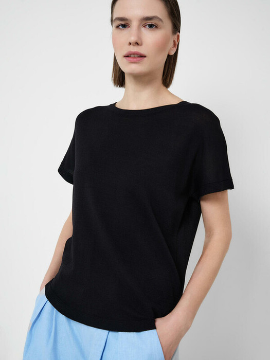 Женский джемпер. Модель свободного кроя, средней длины, выполнен из тонкого мягкого трикотажа. У изделия круглая горловина, короткие рукава и прямой низ.