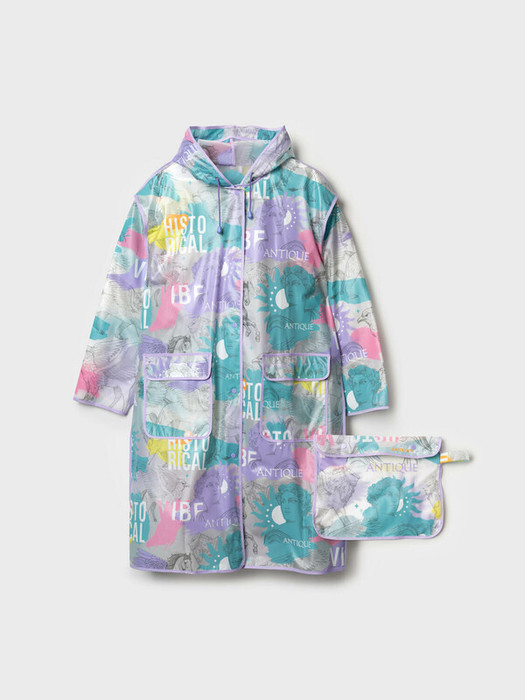 Женский плащ-дождевик с фирменным принтом в коллекцию. Капюшон с утяжкой. Застежка на кнопки. Материал  ЭВА. Без подкладки. Модель имеет спереди два накладных кармана с клапаном. Добавлена петелька под капюшоном с внешней стороны, чтобы остальные вещи на вешалке не намокали. Сзади есть светоотражающая полоска. Идеально подходит для парного образа мама-дочь, так как такая модель есть в детских размерах.  В комплекте идет непромокаемая сумочка.