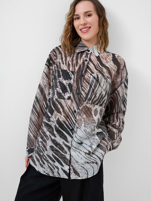 Женская рубашка с анималистичным принтом. Модель свободного кроя с длинным рукавом. Выполнена из лёгкой и полупрозрачной ткани, что придаёт образу воздушность. У рубашки классический воротник, застёжка на пуговицы и два нагрудных накладных кармана. Рукава с манжетами на пуговицах.