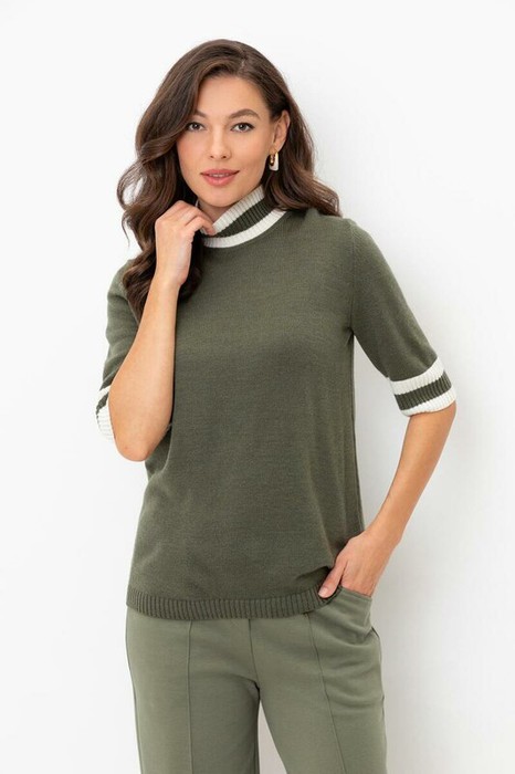 Джемпер в стиле прямой футболки, воротником-стойкой и короткими рукавами. Прямой силуэт, стандартная длина. Средняя плотность вязания, пластичная фактура. Выполнен гладью из мягкой полушерстяной пряжи. Шерсть в составе сохраняет тепло, а благодаря волокнам акрила изделие мягкое и дольше сохраняет форму.