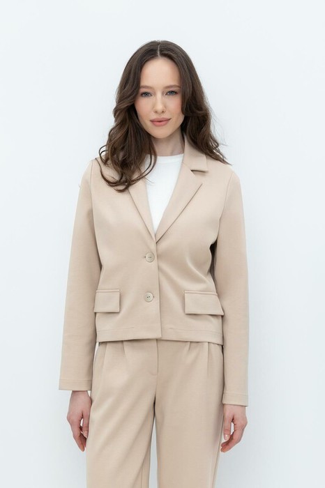 Женский укороченный жакет прямого кроя с имитацией карманов с клапаном из плотного набивного гладкого трикотажа интерлок. Гладкий и плотный материал на основе хлопка сохраняет форму.