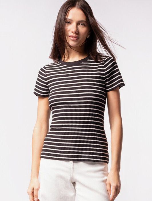 Футболка выполнена из трикотажа в широкий рубчик. Премиальное качество хлопковых волокон и наличие эластана в составе изделия, обеспечивают абсолютный комфорт, не сковывая движений. Изделие обладает хорошей формоустойчивостью и надолго сохранит свой безупречный внешний вид. Металлический логотип бренда.