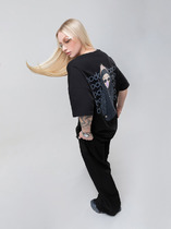 Футболка выполнена из эластичного футера двухнитки. Авторский принт нанесен фактурными красками с устойчивым покрытием. Модель свободного кроя, по низу изделия дополнена хлопковым шнуром с металлической фурнитурой. Изделие сочетается в костюме с шортами D48.010, брюками D44.135 и D44.137