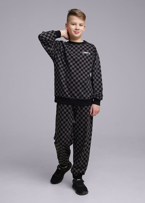 Принтованные брюки в ""шахматку"" сделают образ по-настоящему стильным. Модель свободного объема, для спорта и активного отдыха. Резинка из кашкорсе по низу, эластичный пояс на шнурке. Дополни брюки принтованным свитшотом в цвет модели из коллекции.