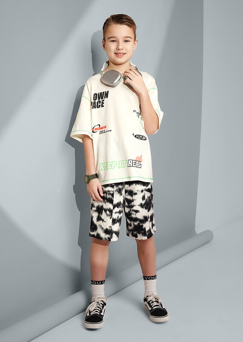 Стильные набивные шорты для мальчика из мягкого трикотажного полотна. Пояс на резинке с регулировкой обеспечивает комфортную посадку. Декоративные резы по переду с необработанными краями создают модный акцент.