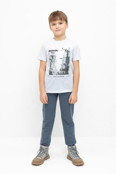 Трикотажные брюки для мальчика из петельчатого футера. Эластичный пояс на резинке регулируется по ширине с помощью шнурка, по бокам два удобных кармана, внизу эластичные манжеты.