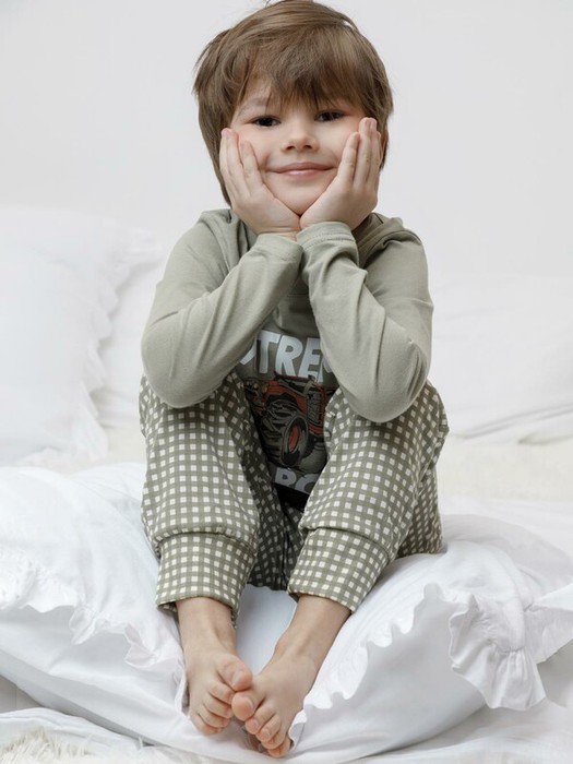 Пижама для мальчика из натурального хлопка. Джемпер с длинными втачными рукавами и брюки с эластичной резинкой в поясе. Мягкие манжеты по низу брюк сделаны из материала в рубчик. Оригинальная набивка и принт выполнены из стойких текстильных гипоаллергенных красителей. Изделие сохраняет цвет и форму после многократных стирок. Все трикотажные полотна производятся в соответствии с нормами швейцарского сертификата ЭкоТекс.