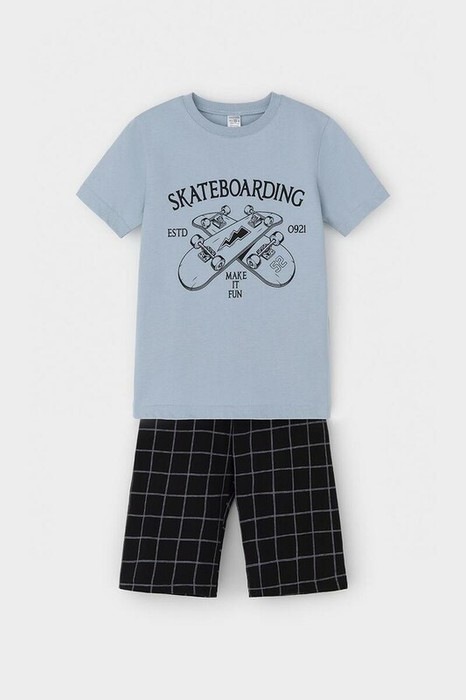 Трикотажная пижама из натурального хлопка. Футболка с короткими втачными рукавами и шорты с эластичной резинкой в поясе. Оригинальные набивка и принт выполнены из стойких гипоаллергенных текстильных гипоаллергенных красителей. Изделие сохраняет цвет и форму после многократных стирок. Все трикотажные полотна производятся в соответсвии с нормами швейцарского сертификата ЭкоТекс.