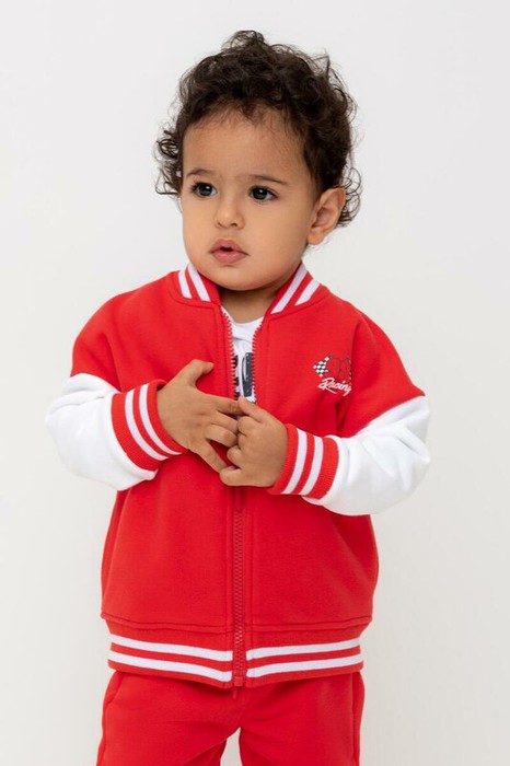 Бомбер для мальчика с контрастными рукавами из мягкого трикотажа. В составе 80% натурального хлопка и 20% полиэстера, при этом полиэстер ввязан внутрь по особой технологии и не соприкасается с кожей. Воротник, манжеты и пояс - вязаные. Застёгивается на молнию. По бокам два удобных кармана.