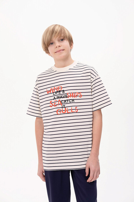 Футболка для мальчика свободного кроя - это идеальный выбор для активного ребенка. Вырез горловины обработан эластичной тканью — она прекрасно держит форму, не растягивается, при этом ребёнку удобно надевать и снимать футболку.По переду принт с надписями. Перевод принта "wind, ships, sea, gulls" - ветер, корабли, море, чайки, "life's a wave catch it" - жизнь это волна, ловите ее. Спортивная футболка подходит как для малышей в детский сад так и для подростков. Она подходит для любого времени года, её можно носить как летом, так и в холодное время года в качестве среднего слоя одежды. Помните о правильном уходе за изделием: рекомендуется стирать при температуре не выше 30 °C, без предварительного замачивания, с изнанки. Это поможет сохранить качество и цвет футболки на длительное время.