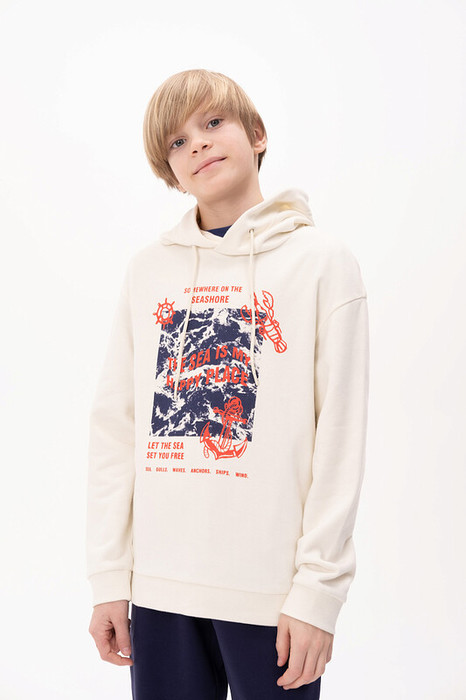 Худи для мальчика без начеса – актуальная вещь в любом сезоне, будь то весна, лето или осень. Кофта спортивная для мальчика выполнена из плотного футера-петля, который отлично согревает в прохладную погоду и при этом хорошо пропускает воздух – ребенок активно двигается, играет, не потеет. Толстовка свободного покроя оверсайз со спущенным плечом, углубленной проймой. Рукава а также низ изделия на манжете из рибаны. Кофта без карманов. Капюшон с регулировкой объема. По переду изделие украшено принтом с надписью. Перевод надписей "somewhere on the seashore" - где-то на побережье, "the sea is my happy place" - море-мое счастливое место, "let the sea set you free" - позвольте морю освободить вас, "sea.gulls.waves.anchors.ships.wind" - море.чайки.волны.якоря.корабли.ветер. Размерный ряд подходит как для малышей так и для подростков.