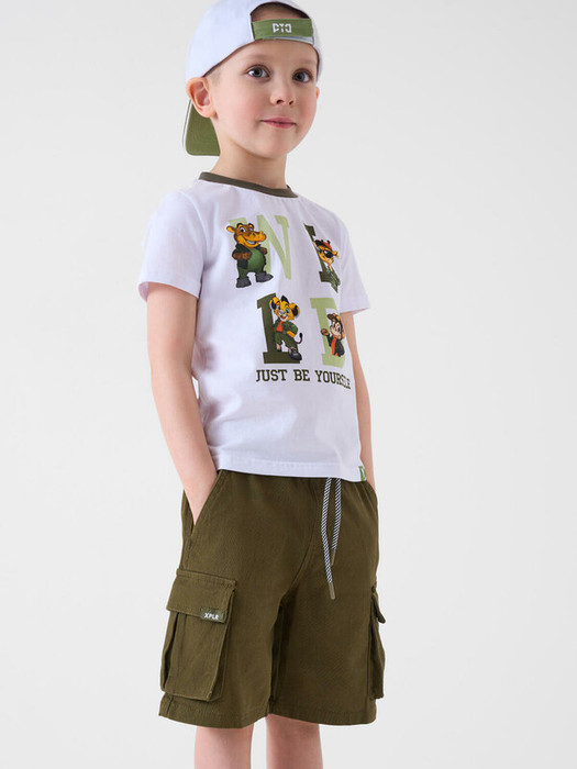 Детские шорты для мальчика. Модель свободного кроя, длиной выше колена. Выполнена из дышащего, хлопкового твилла. Удобный пояс на широкой резинке дополнен декоративным шнуром для регулировки. Два боковых кармана и два кармана-карго, один карман украшен фирменной нашивкой.