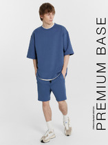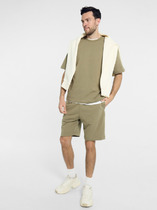 Костюм мужской, состоящий из футболки и брюк. Футболка однотонная с принтом на груди; модель свободная, со спущенной линией плеч, овальным вырезом горловины. Брюки из полотна с набивным рисунком эксклюзивного дизайна, прямые, с боковыми карманами с обтачными входами, на притачном поясе с отстроченной эластичной тесьмой.