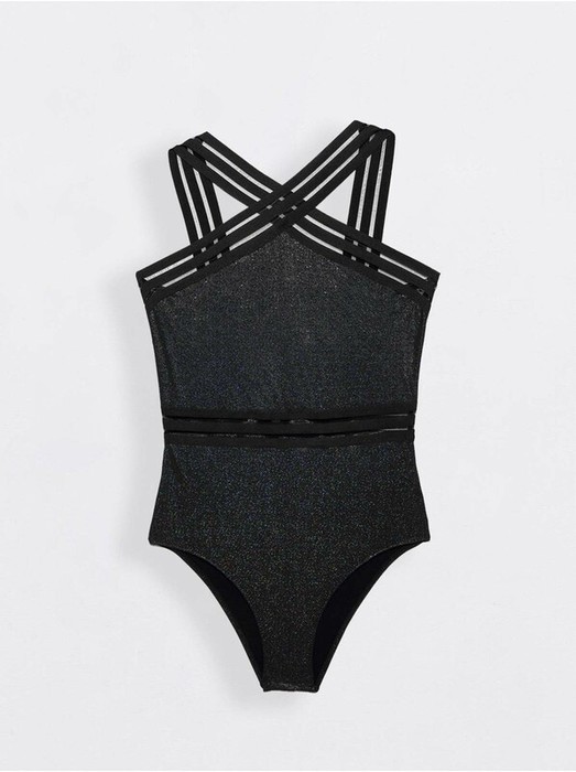 Ультрамодный черный купальник с эффектом легкого мерцания - must have в пляжном гардеробе девушки, которая хочет стать звездой пляжа. Соблазнительные акценты поможет расставить декоративная полупрозрачная тесьма на талии, по верху переходящая в эффектные бретели.