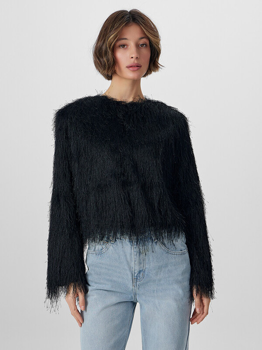 Пушистый жакет из лимитированной коллекции Mark Formelle x Ольга Бузова — тот самый акцент, который сделает ваш праздничный образ завершенным. Укороченный крой, роскошная бахрома и декоративный край придают ему особый шарм и индивидуальность.