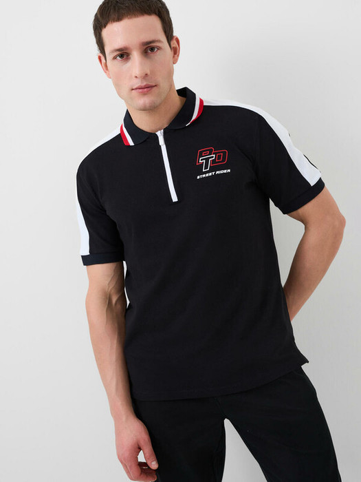 Мужская футболка-поло. Модель с короткими рукавами, выполненная в спортивном стиле. Поло прямого кроя, средней длины, с воротником и манжетами из плотной рифлёной ткани. Спереди нанесены принты в гоночной тематике. Планка на молнии. Материал - хлопковый трикотаж пике.