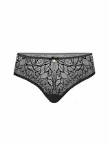 Кружевные трусики модели Hipster со средней посадкой с увеличенным бочком. Нежная резинка по талии. Подгиб и плоский шов по вырезку ножки спереди и кружевное полотно сзади. Ластовица из хлопка. Декоративная металлическая подвеска с заглавной буквой бренда