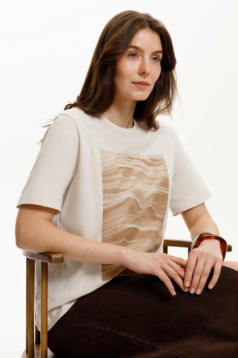 Футболка прямого силуэта из высококачественного гребенного хлопка. Мягкий на ощупь принт выполнен из водных красок, что обеспечивает устойчивость к многократным стиркам.