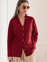 Свободный крой блузки и спущенная линия плеча  дарят ощущение легкости и непринужденности, делая образ одновременно женственным и современным. Широкие рукава средней длины гармонично дополняют образ и идеально подходят для полных рук, обеспечивая комфорт, свободу движений и уверенность. Аккуратная застежка на маленькую пуговицу добавляет утонченности, а круглый вырез красиво обрамляет шею, создавая аккуратную линию декольте.