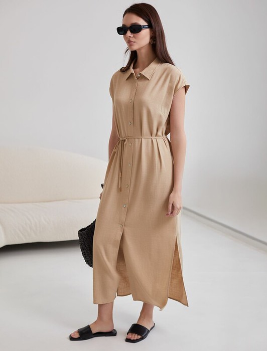 Совместные покупки Уфа Женская одежда Платья — 21.04 Vilatte Длинное платье-рубашка с поясом и разрезами изо льна с вискозой D2