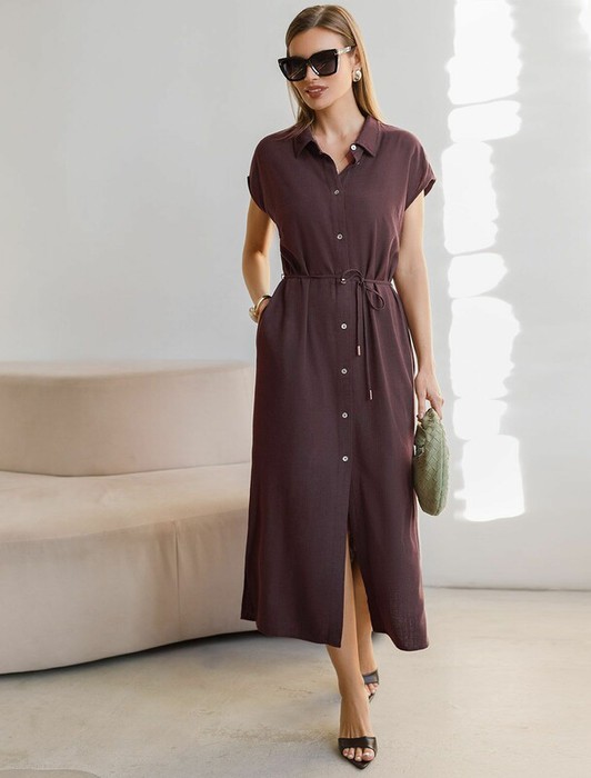 Совместные покупки Уфа Женская одежда Платья — 21.04 Vilatte Длинное платье-рубашка с поясом и разрезами изо льна с вискозой D2