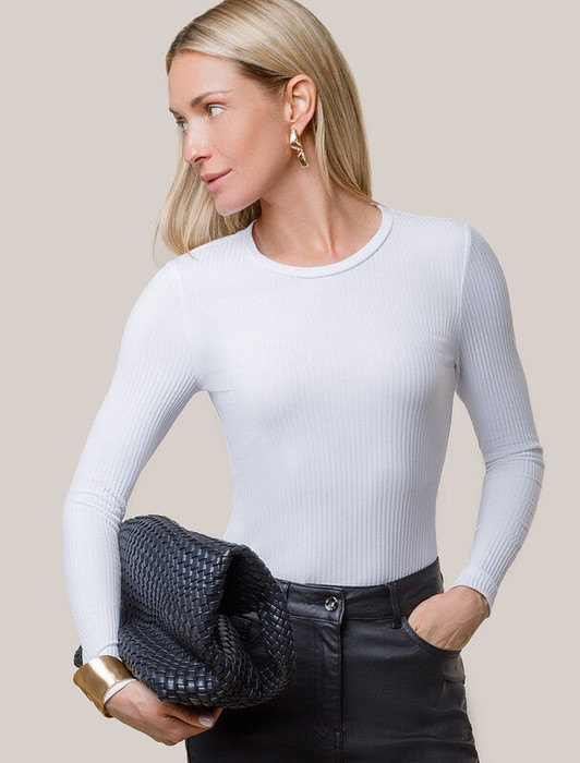 Джемпер с круглым вырезом выполнен из фактурного трикотажа в широкий рубчик. Модель идеально сидит по фигуре не сковывая движения. Хлопковый трикотаж поддерживает оптимальную температуру тела, поэтому в изделии будет комфортно в течении всего дня. Наличие эластана в составе гарантирует формоустойчивости. Базовая модель впишется в любой гардероб.