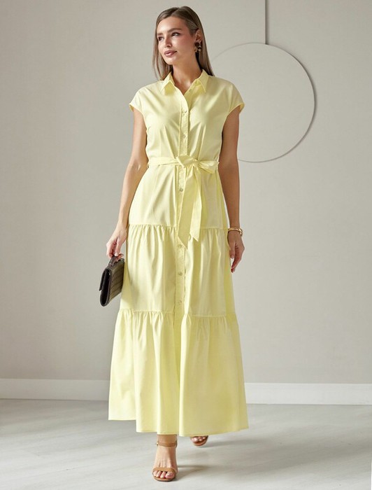Платье А-силуэта с поясом фисташкового цвета выполнено из легкого хлопкового поплина плотностью 123 Г/м2. Воздушное платье на пуговицах по всей длине с пышной юбкой-воланами в стиле бохо отличный вариант для теплой и жаркой погоды. Модель обладает красивым ярусным кроем, который придает образу женственность и элегантность. Отложной воротничок и короткий рукав создают стильный акцент, подходящий для повседневного ношения и различных ситуаций. Талия подчеркнута поясом, который легко регулируется и подчеркивает силуэт, придавая особый шарм и аккуратность образу.  Натуральный состав ткани обладает высокой воздухопроницаемостью, а также способностью поглощать и отдавать влагу. В повседневном платье будет очень комфортно, благодаря правильной регуляции температуры тела. Такая модель подходит на маленький  и высокий рост, а так же на любую фигуру, позволяя подчеркнуть достоинства и скрыть возможные недостатки. Это длинное платье отлично подойдет тем, кто ценит удобство и утонченность в одежде из качественной вискозы