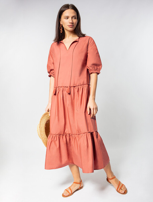 Платье с V-вырезом выполнено из легкого хлопкового поплина. Воздушная модель с пышной юбкой-воланами в стиле бохо отличный вариант для жаркой погоды. Натуральный состав ткани обладает высокой воздухопроницаемостью, а также способностью поглощать и отдавать влагу. В изделии будет очень комфортно, благодаря правильной регуляции температуры тела. Подходит для любой фигуры.