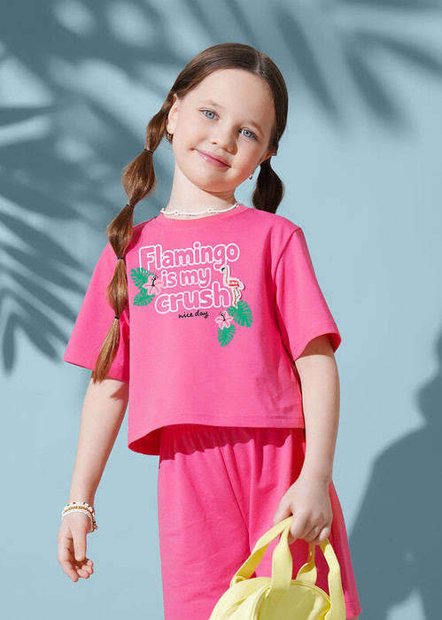 Укороченная футболка из хлопка для девочки. Круглый вырез горловины оформлен эластичной окантовкой. По центру переда трендовый принт с декором. Сочетай футболку с брюками и шортами из новой коллекции!