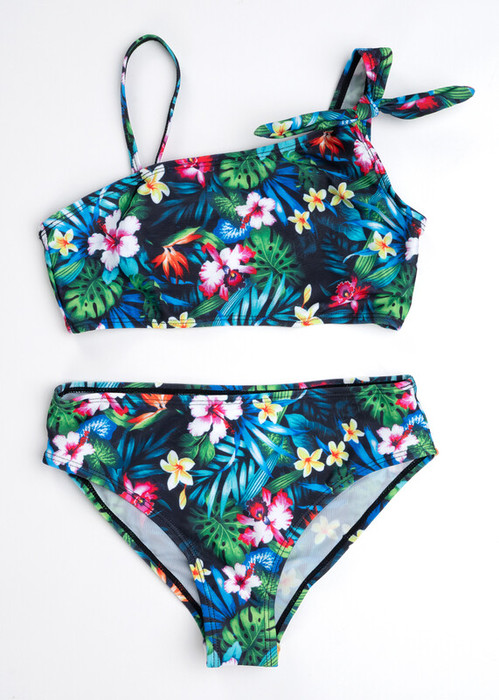 Раздельный купальник в тропическую цветочную набивку из 2х предметов. Плавки классические впереди на подкладе. Топ на одно плечо, тонкая бретель регулируется, впереди подклад.