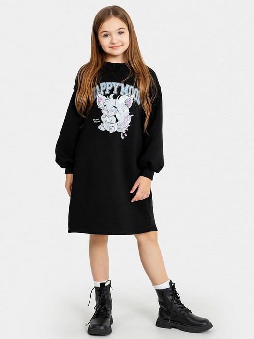 Платье свободного силуэта. Горловина круглой формы обработана обтачкой из рибаны. Шов притачивания рибаны распошит. Рукава длинные, втачные, внизу на сборке. Линия плеча спущена. По низу рукавов притачные манжеты из рибаны. Центральный шов по спинке с разрезом снизу. Низ изделия обработан на 2-х игольной плоскошовной машине швом в подгибку. Длина платья выше колена.