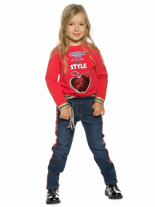 Джинсы для девочек с начёсом прямого силуэта, по бокам брючин декоративная капроновая тесьма с пайетками, по переду изделия золотистый карабин с принтованной репсовой тесьмой, перевод надписи Доверяй своему творчеству, пояс из эластичной рибаны с внутренней регулировкой шнурком.